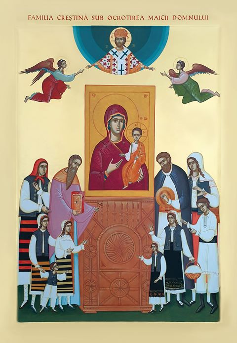 Icoana a fost pictată de Gabriel Solomon din Cluj-Napoca și reprezintă pe Maica Domnului care, în mod simbolic, ocrotește cele două familii: una preoțească și cealaltă, mirenească, laică, în mijlocul lor fiind reprezentată o autentică poartă maramureșeană.