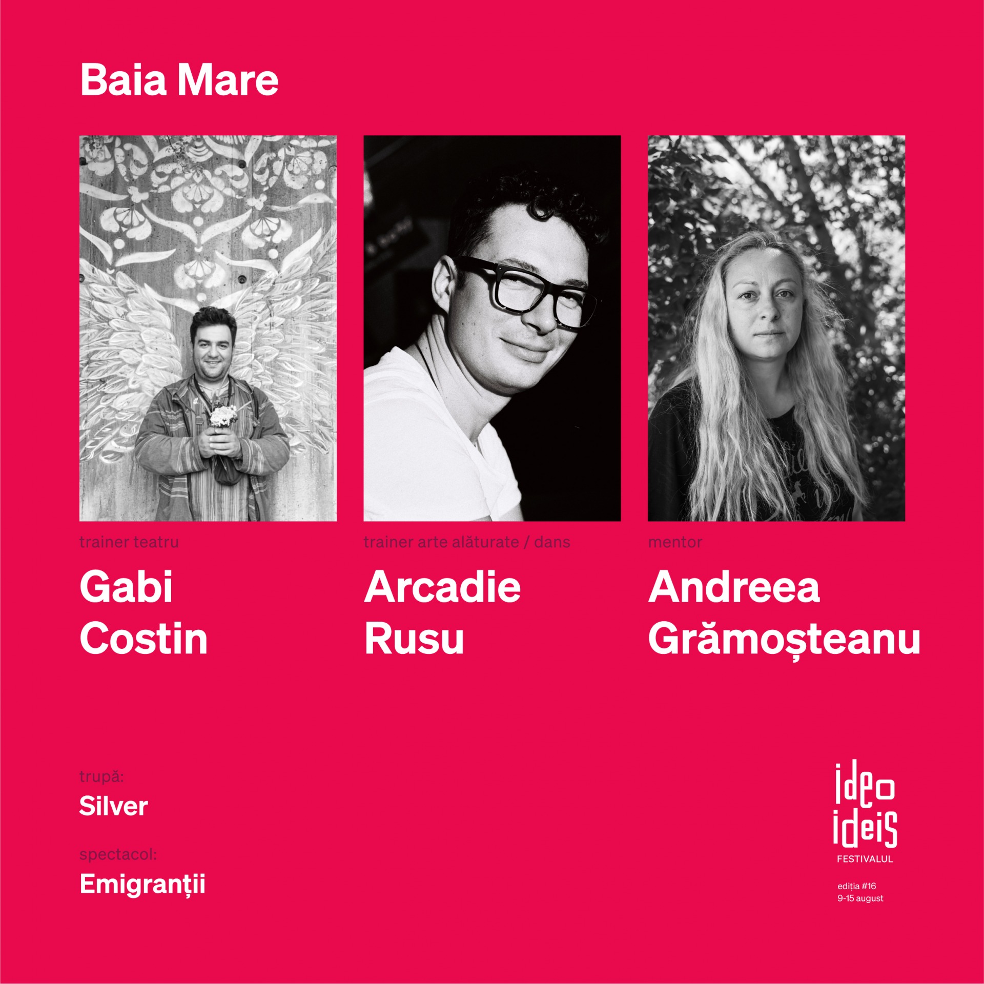 Sâmbătă, 14 august, ora 19, pe scena Teatrului Municipal Baia Mare, va urca trupa de teatru tânăr, Silver, cu spectacolul Emigranții, care tratează subiectul piesei scrise de autorul polonez Sławomir Mrożek, povestea a doi emigranți din Polonia comunistă, stabiliți undeva în Germania, în pivnița unei clădiri. Spectacolul este în regia lui Han Andrei, iar din distribuție fac parte Teodora Țolaș, Ștefan Iulian Amarandei, Delia Heredea, Teodora Trufan, Erik Waltner și Alexandra Cirț. După spectacolul care va avea loc în fața comunității băimărene, va urma un artist talk cu mentorul Andreea Grămoșteanu.