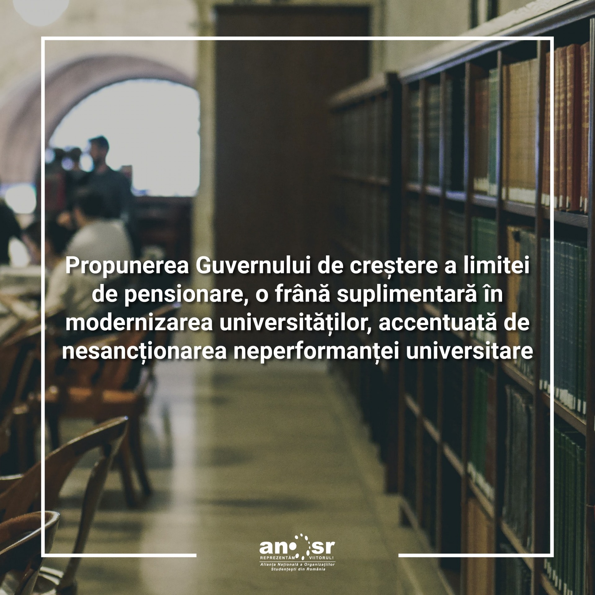 ANOSR critică intenția Guvernului de a introduce posibilitatea prelungirii calității de titular până la 70 de ani pentru cadrele didactice din învățământul superior la latitudinea exclusivă a titularului, conform proiectului de lege aprobat ieri, 9 iunie, în ședința de Guvern, și solicită Parlamentului României eliminarea acestei prevederi lipsite de orice beneficiu pentru studenții din România.