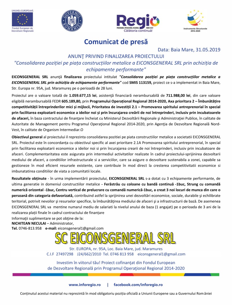 EICONSGENERAL SRL anunţă finalizarea proiectului intitulat „Consolidarea poziției pe piața construcțiilor metalice a EICONSGENERAL SRL prin achiziția de echipamente performante” cod SMIS 113159, proiect ce s-a implementat in Baia Mare, Str. Europa nr. 95A, jud. Maramureș pe o perioadă de 28 luni.