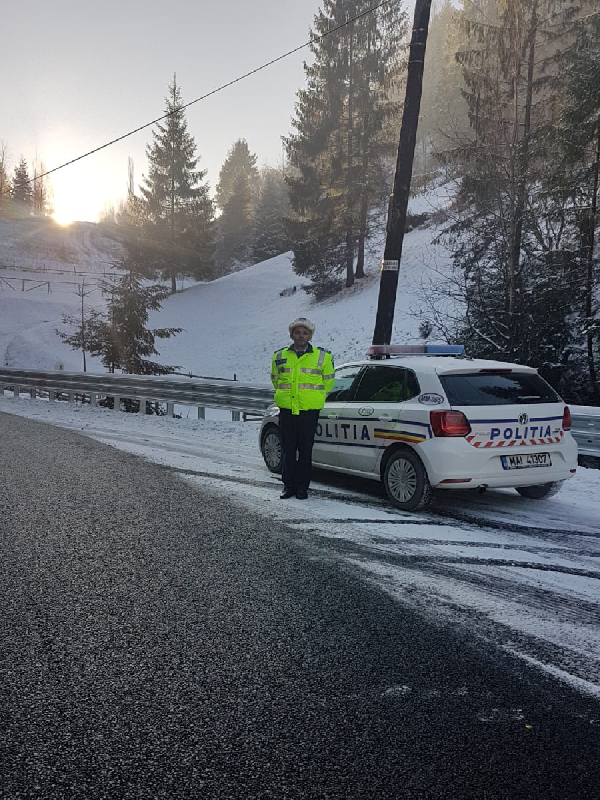 Din fericire, pe raza judeţului nostru nu sunt drumuri blocate sau cu circulaţie restricţionată, dar se circulă în condiţii de iarnă. Pentru că unele sectoare de drum pot fi acoperite cu zăpadă, gheaţă sau polei, vă sfătuim ca atât în localităţi cât şi în afara acestora să circulaţi cu o viteză care să permită oprirea în siguranţă şi să păstraţi distanţa în mers! Dacă în viaţa de zi cu zi se numeşte spaţiu personal, în trafic se numeşte distanţă de siguranţă! Dacă vă aflaţi pe un drum aglomerat, păstraţi-vă calmul şi nu uitaţi de politeţea în trafic! Manifestaţi atenţie sporită în zona trecerilor pentru pietoni, mai ales că unul dintre pietonii de azi poate fi chiar Moş Nicolae!
