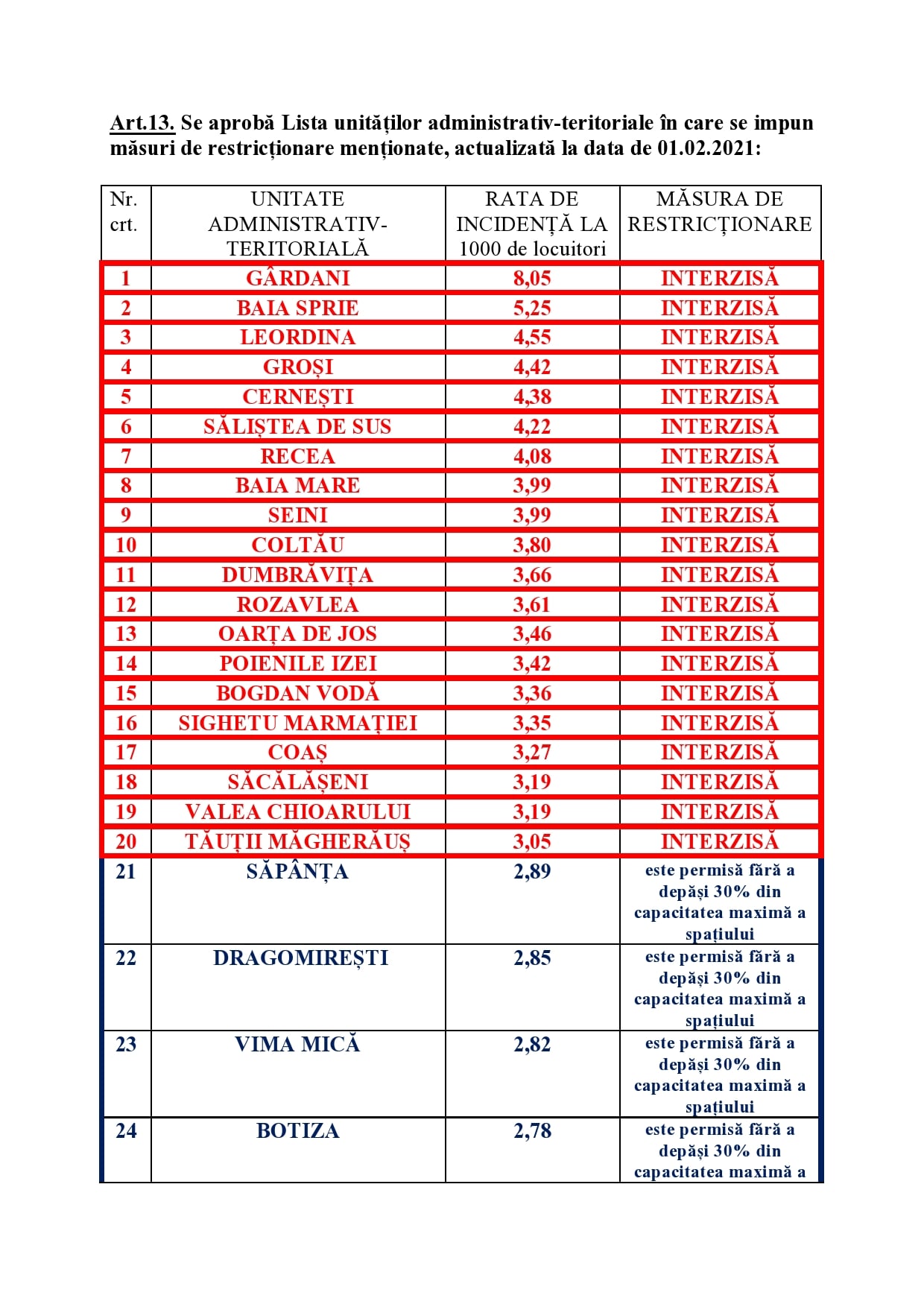 Baia Mare și alte 19 localităţi din judeţ intră în SCENARIUL ROŞU din 8 februarie