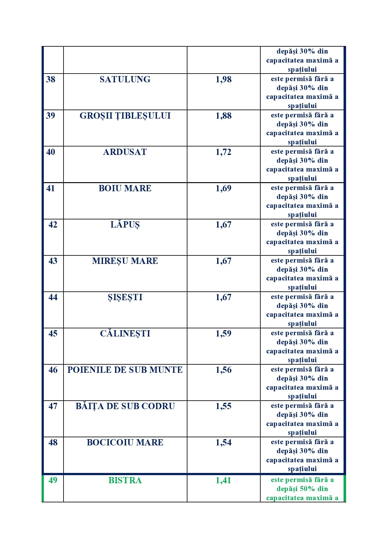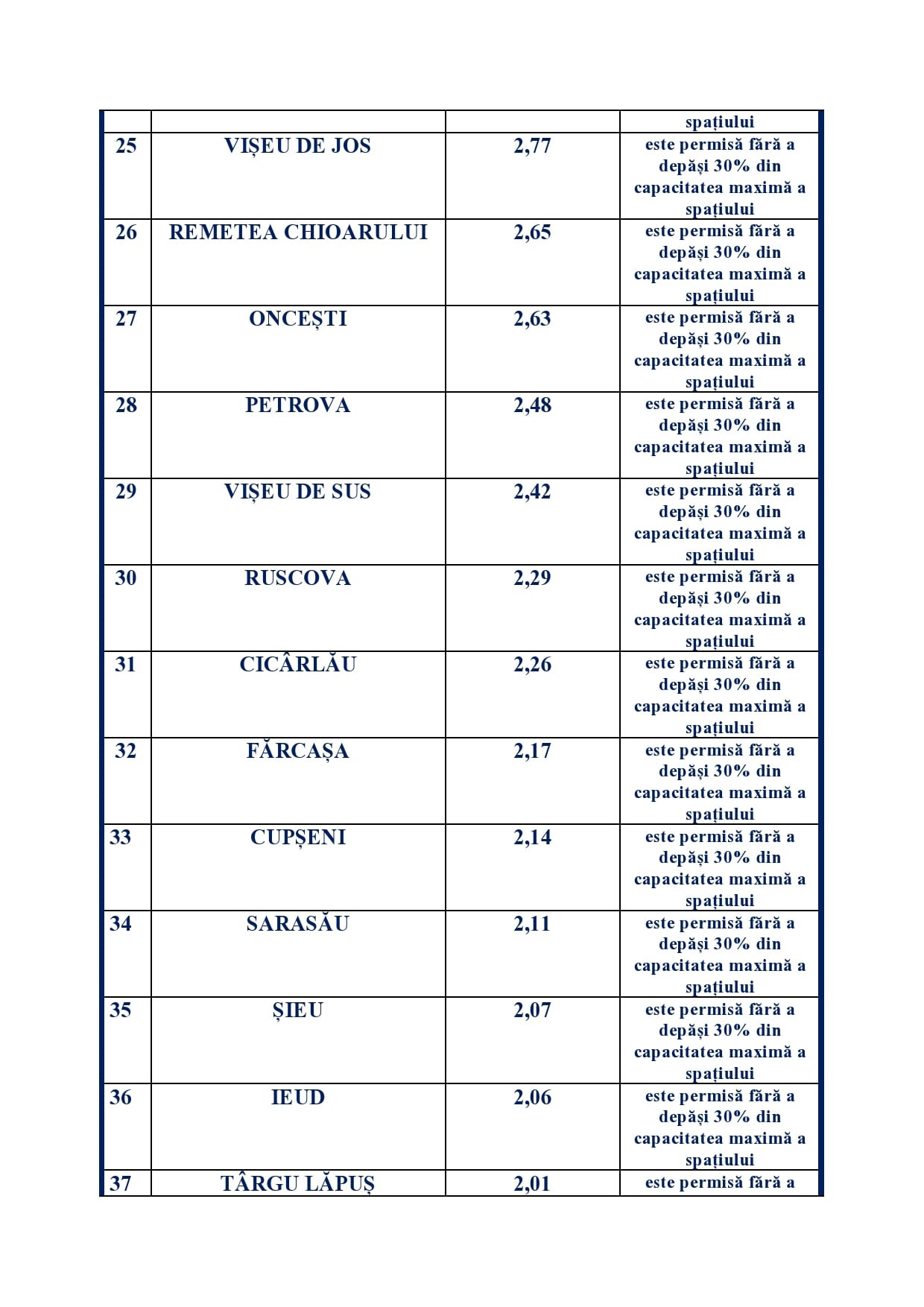 c)fără a depăși 30% din capacitatea maximă a spațiului și în intervalul orar 5.00-21.00, dacă incidența cumulată în ultimele 14 zile a cazurilor în unitățile administrativ-teritoriale este mai mare de 1,5 și mai mică sau egală cu 3/1.000 de locuitori.