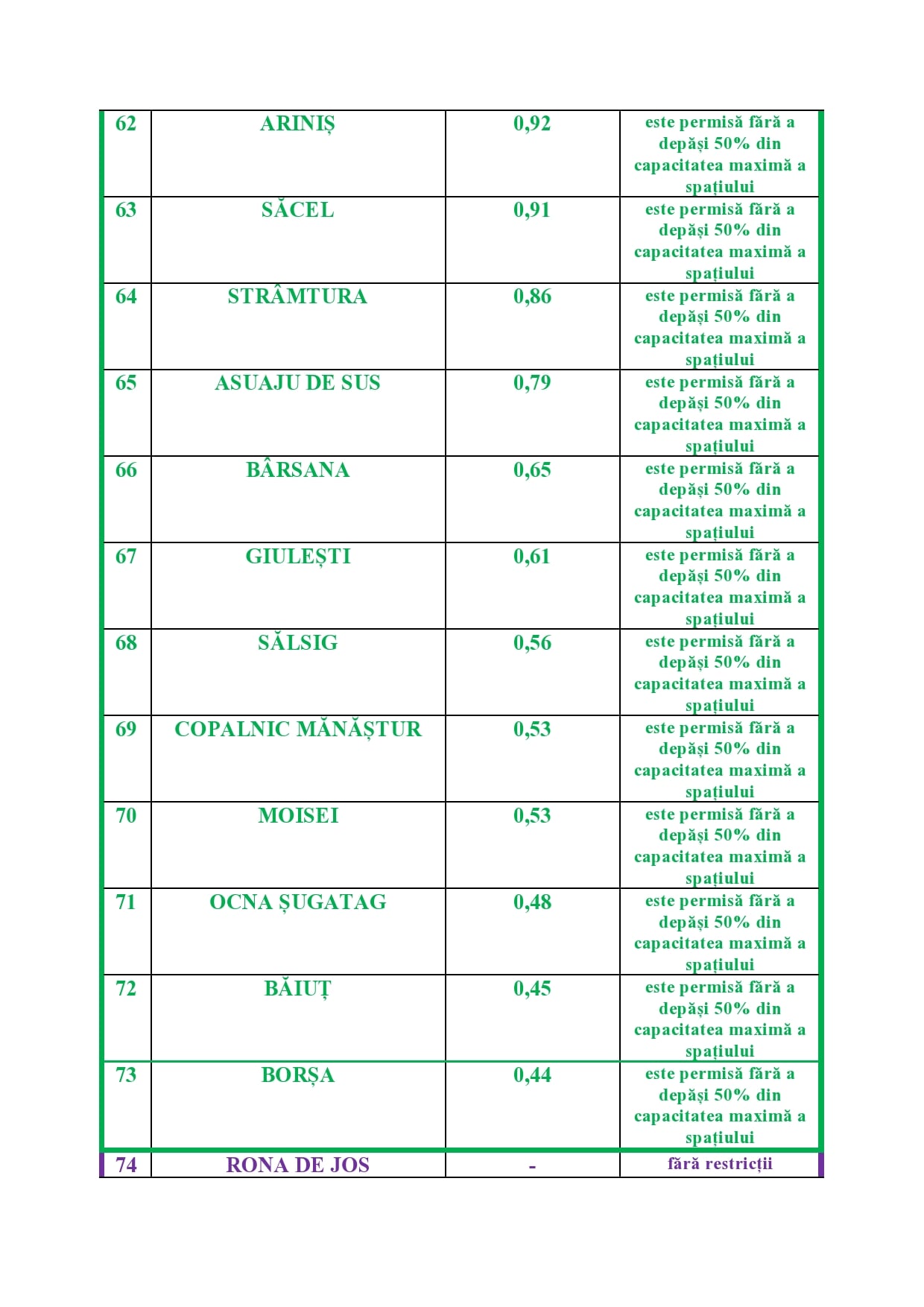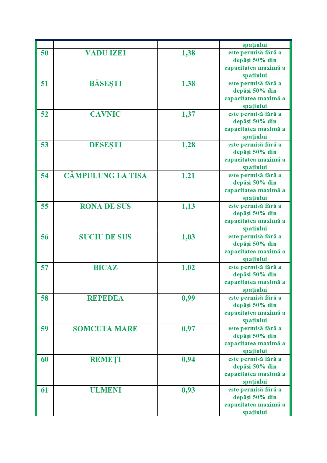 a). fără a depăși 50% din capacitatea maximă a spațiului în unitățile administrativ-teritoriale unde incidența cumulată a cazurilor în ultimele 14 zile este mai mică sau egală cu 1,5/1.000 de locuitori,