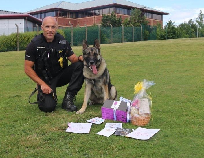 Câinele, retras din activitate după ce a făcut parte din West Mercia Police, a suferit mai multe răni în timp ce a continuat să se lupte cu un bărbat înarmat cu un cuţit de 25 cm, chiar şi după ce poliţistul alături de care se afla, Mike Davey, a fost înjunghiat.