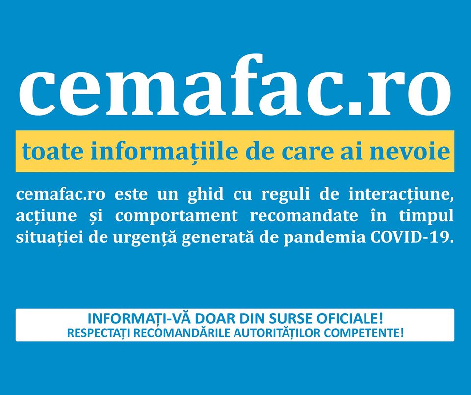 cemafac.ro este un ghid cu reguli de interacțiune, acțiune și comportament recomandate în timpul situației de urgență generată de pandemia COVID-19. Portalul aduce mai aproape de voi regulile de bază recomandate de autorități de la care este indicat să nu ne abatem în această perioadă.