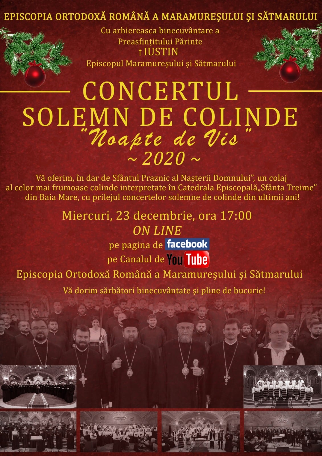 Cu binecuvântarea Preasfințitului Părinte Iustin, Episcopul Maramureșului și Sătmarului, miercuri, 23 decembrie, cu începere de la ora 17:00, va avea loc în mediul online – pe pagina oficială de Facebook și pe canalul oficial de YouTube ale Episcopiei noastre – Concertul solemn de colinde „Noapte de vis”.