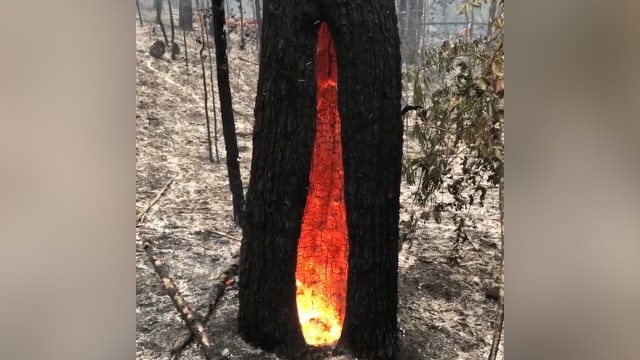 Imagini incredibile surprinse în Australia. Un arbore aflat într-una din zonele în care incendiul a fost stins continuă să ardă în interior. În clip se observă cum o bucată din scoarţă copacului a fost distrusă complet, iar flăcările au avansat în interiorul trunchiului, izolate de apă de restul scoarţei.