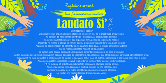 Duminică, 24 mai, se încheie, printr-o rugăciune globală online, săptămâna „Laudato Si’” (16-23 mai 2020), care „marchează a V-a aniversare a Enciclicei Papei Francisc despre îngrijirea casei comune, o enciclică de mare actualitate și relevanță în contextul situației actuale a întregii planete, o enciclică ce propune principiile ecologiei integrale ca răspuns la provocările timpului prezent”, citim în comunicatul dat de Acţiunea Catolică din România pe data de 15 mai.