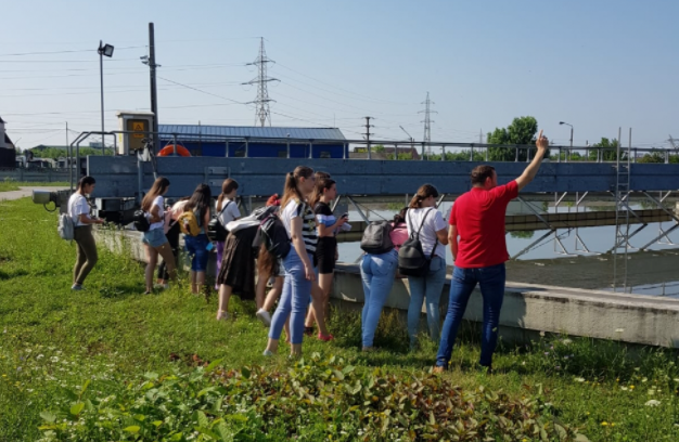 Prima vizită a fost efectuată la Stația de epurare a apei uzate care desevește municipiul Baia Mare. Aici elevii au putut observa mai îndeaproape care sunt etapele prin care trece apa uzată, înainte de a ajunge în râul Săsar. Vizita a început cu prezentarea etapei mecanice unde elevii au văzut cum apa uzată trece prin grătare ce rețin diferitele obiecte ce ajung în rețeaua de canalizare. Prezența obiectelor de îmbrăcăminte, a pungilor din plastic, a scutecelor, șervețelelor umede, jucăriilor sau a altor obiecte i-au determinat pe elevi să constate că mulți dintre băimăreni confundă canalizarea cu coșul de gunoi. Apoi, colegii noștri le-au prezentat elevilor bazinele de separare a grăsimilor, decantoarele și linia de tratare a nămolului, iar mai apoi rezervorul de biogaz și dispeceratul stației de epurare, locul de unde este controlat și coordonat prin sistem SCADA întregul proces tehnologic de epurare a apelor uzate.