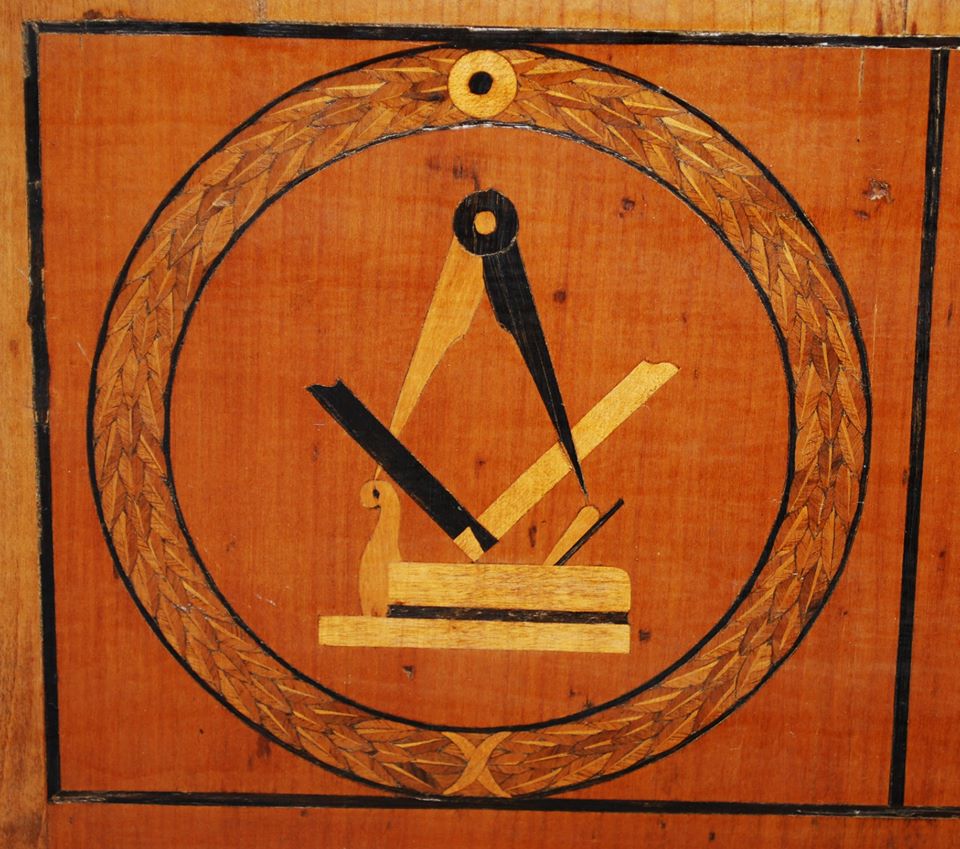 Decoraţia din partea frontală a lăzii este împărţită în trei registre. În registrul central sunt plasate două cercuri concentrice, reprezentând o cunună de lauri, iar în cele două registre laterale sunt redate uneltele specifice tâmplarilor şi lăcătuşilor (echerul, compasul şi rindeaua, respectiv două chei încrucişate şi un ciocan). Acelaşi ornament se păstrează şi pe spatele lăzii. Dispunerea echerului şi compasului face o evidentă trimitere la ritualul francmasonic de gradul al II-lea. Pe cele două laturi se află două mânere din fier forjat. Lada de breaslă datează din secolul al XVIII-lea.
