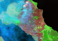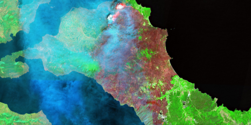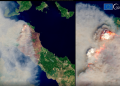 În altă imagine se vede fumul de la incendii cum se ridică deasupra insulei, fotografie realizată de la o distanță de aproximativ 800 de kilometri, altitudinea la care orbitează sateliții Sentinel.