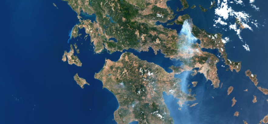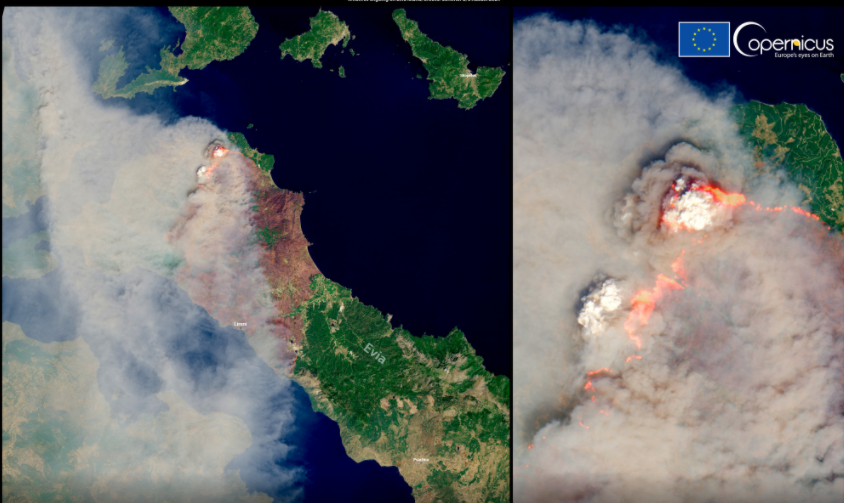 Pe site-ul programului Copernicus au fost publicate mai multe imagini făcute de sateliții Sentinel, care surprind proporțiile dezastrului din Evia. Una din fotografii este compusă din două imagini alăturate, practic același cadru surprins din spațiu la o distanță de zece zile: pe 1 august, când partea de nord a insulei Evia este complet înverzită, și pe 11 august, după izbucnirea incendiilor, când se vede clar cât de tare a fost pârjolită insula.