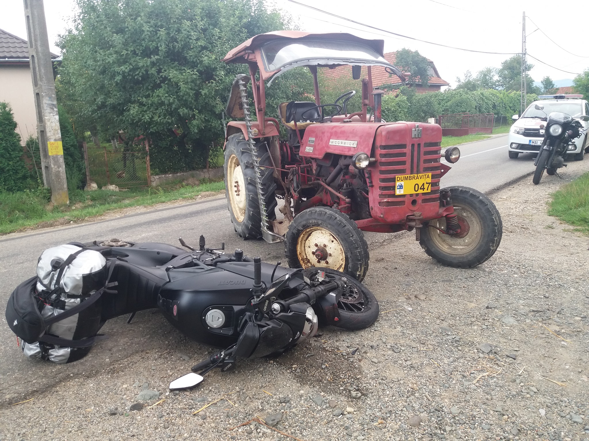 Șoferul unui tractor nu s-a asigurat la corespunzători şi a lovit în plin un motociclist.