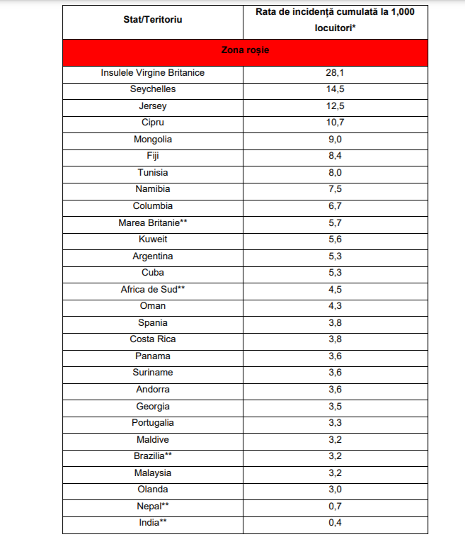 Astfel, în zona roșie au intrat, în urma creșterii cazurilor, Spania, Portugalia, Olanda, Andorra, Georgia și Malaysia.