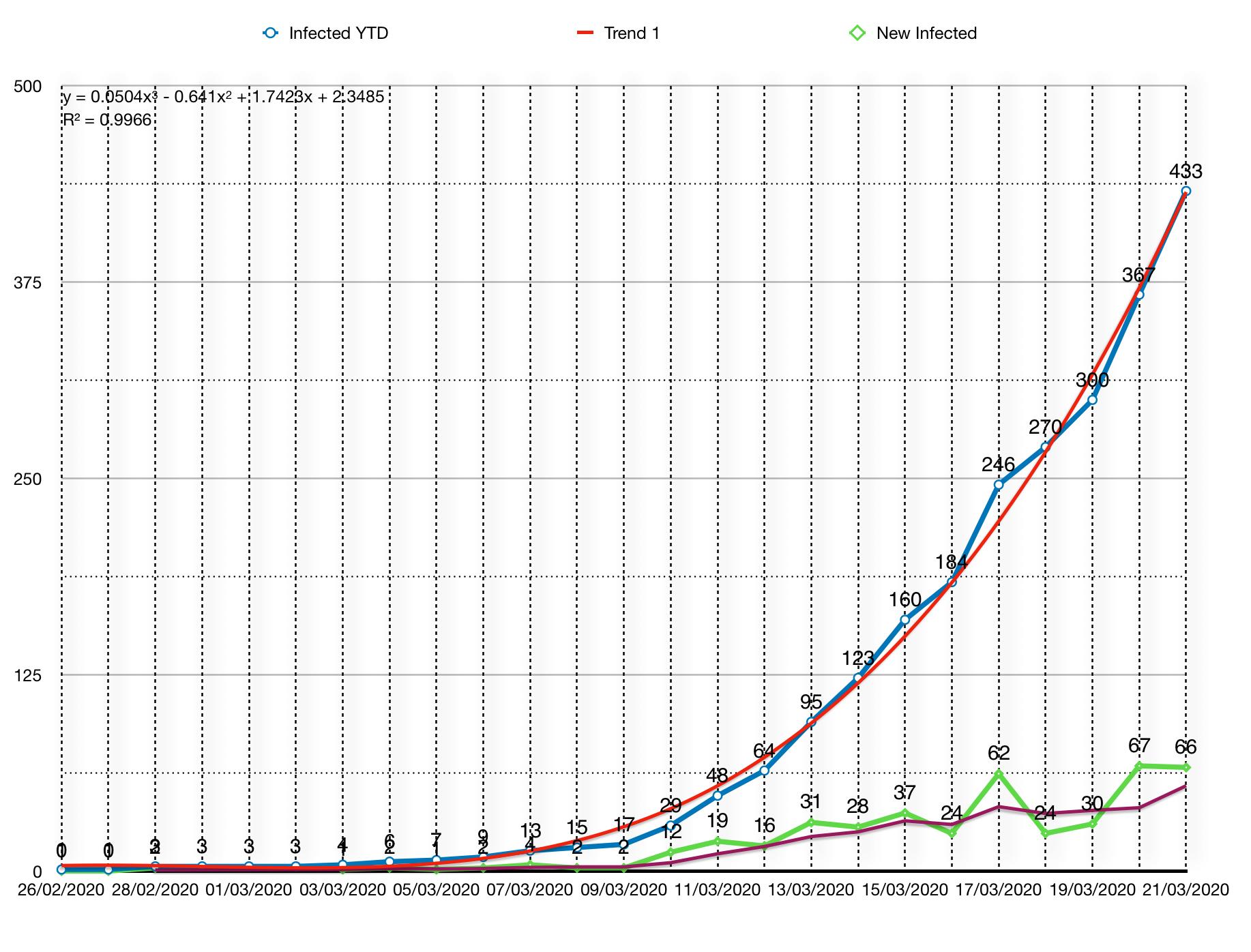 „Vestea bună a zilei: e a patra zi consecutivă în care ne-am îndepărtat de un scenariu de creștere exponențială. E încă devreme să spunem dacă asta e o realitate sustenabilă sau nu, dat fiind nivelul infim de testare, dar pe baza dateleor acumulate, în condiții de metode de testare similare, așa arată lucrurile. Cu evoluția actuală, regresia cea mai potrivită (aproximează realitatea în proporție de 99,66%) e un polinom de gradul 3. Nu e ideal, dar e mai bine decât o evoluție exponențială. Mult mai bine. Dacă lucrurile rămân așa, ajungem la 10.000 de cazuri în 35 de zile, totuși. Poate ne vine mintea la cap și stăm o lună acasă, că n-o fi foc. Detalii în grafic.” – Adrian Stanciu