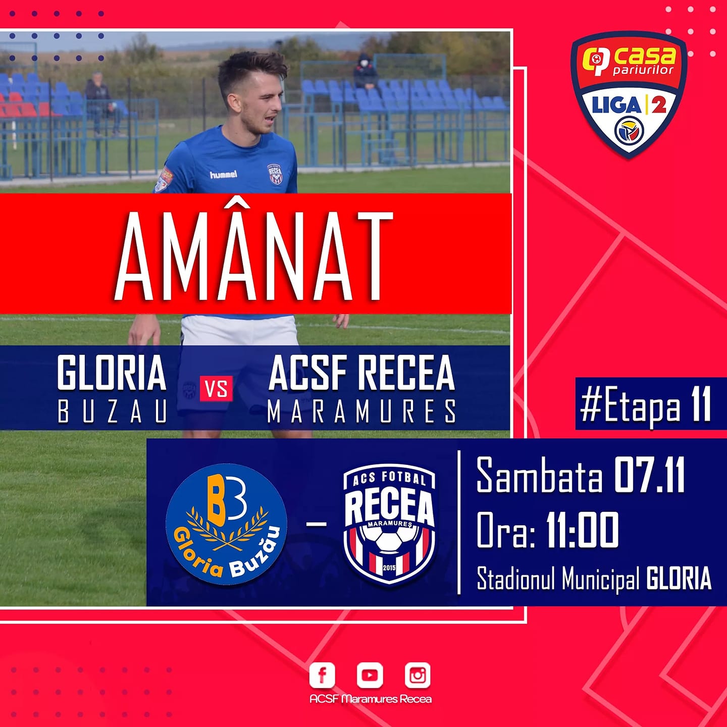 ACSF Maramures Recea informeaza suporterii echipei că partida dintre SCM Gloria Buzău şi Maramures Recea, din etapa cu numărul 11 a Ligii a 2-a, programată să se dispute sâmbătă, 7 noiembrie 2020, cu începere de la ora 11:00, nu se mai desfășoară.