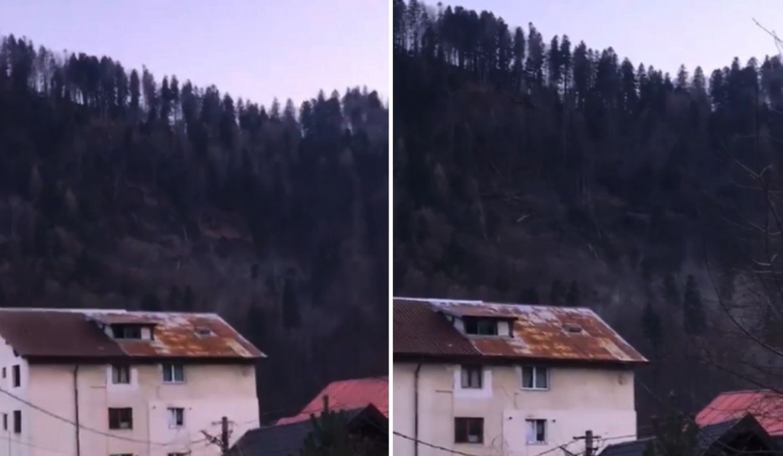 Noi imagini cu alunecarea de teren a unui versant, cu tot cu pădure, în Azuga, au fost surprinse de un martor. Pământul a luat-o la vale și s-a prăbușit în pârâul Azuga, blocând cursul apei.