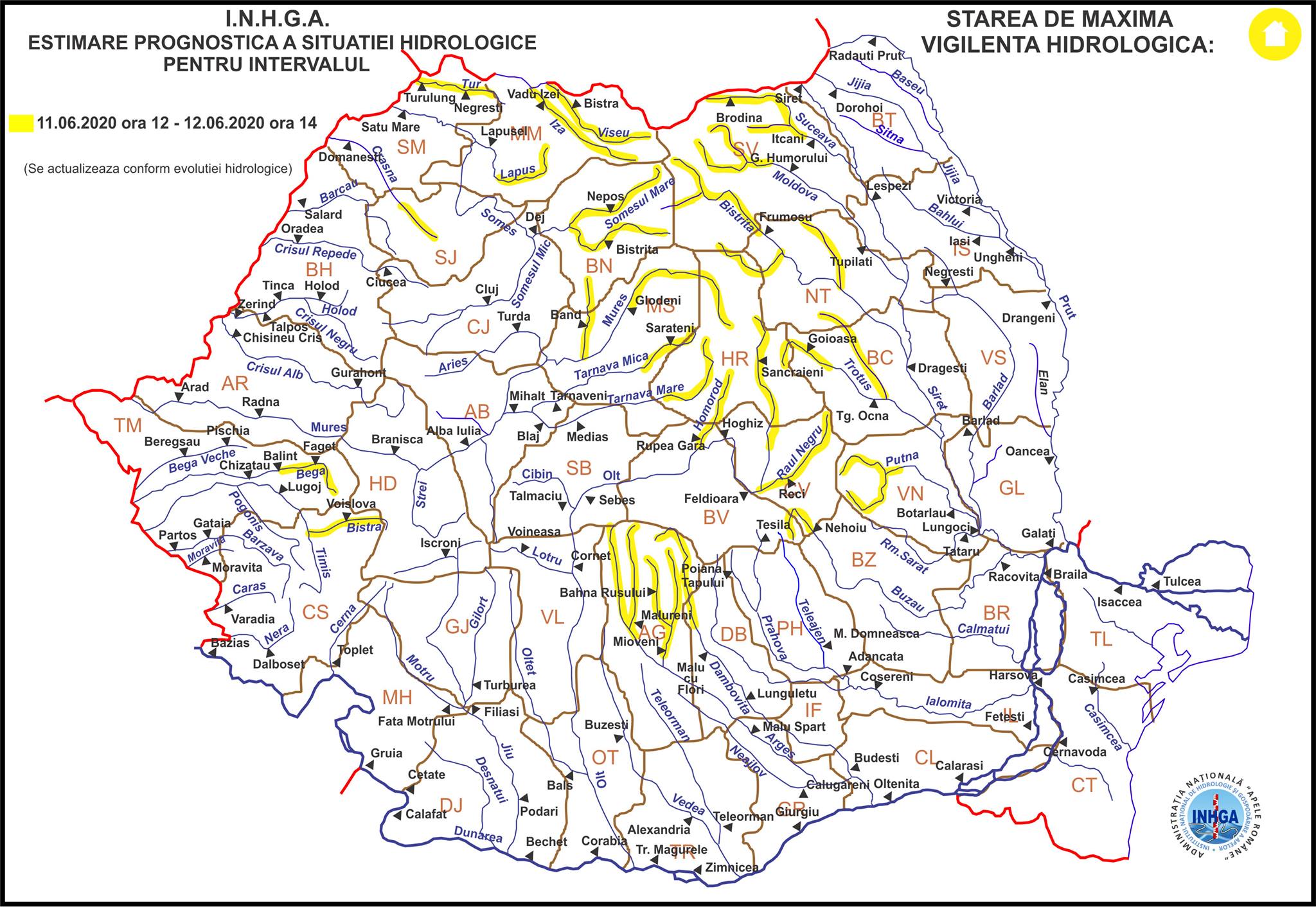 În intervalul 11.06.2020 ora 12:00 – 12.06.2020 ora 14:00 pe râurile din bazinele hidrografice: Vişeu, Iza, Tur (judeţele Maramureş şi Satu Mare), Someşul Mare – bazin superior şi afluenţi bazin mijlociu şi inferior (judeţul Bistriţa Năsăud), Lăpuş – bazin superior şi afluenţi bazin mijlociu şi inferior (judeţul Maramureş), Someş – afluenţii mici aferenţi sectorului aval S.H. Dej (judeţele Cluj, Sălaj, Maramureş şi Satu Mare), Crasna – bazin superior şi afluenţi bazin mijlociu şi inferior (judeţele Sălaj şi Satu Mare), Mureş – bazin superior amonte S.H. Glodeni şi afluenţii aferenţi sectorului aval S.H. Glodeni – amonte confluenţă cu râul Arieş (judeţele Harghita, Mureş şi Bistriţa Năsăud), Târnava Mare – bazin superior şi afluenţi bazin mijlociu şi inferior, Târnava Mică – bazin superior şi afluenţi bazin mijlociu şi inferior (judeţele Harghita, Mureş, Sibiu şi Alba), Bega – bazin superior (judeţul Timiş), Timiş – afluenţii aferenţi sectorului aval S.H. Sadova – amonte S.H. Lugoj, (judeţele Timiş şi Caraş Severin), Olt – bazin superior amonte S.H. Micfalău şi afluenţii aferenţi sectorului aval S.H. Micfalău – amonte S.H. Sebeş Olt (judeţele Harghita, Covasna, Braşov şi Sibiu), Argeş – bazin superior, Dâmboviţa – bazin superior (judeţele Argeş şi Dâmboviţa), Buzău – bazin superior amonte S.H. Nehoiu (judeţele Braşov, Covasna şi Buzău), Suceava – bazin superior şi afluenţi bazin mijlociu şi inferior (judeţul Suceava), Moldova – bazin superior şi afluenţi bazin mijlociu şi inferior (judeţele Suceava şi Neamţ), Bistriţa – bazin superior şi afluenţi bazin mijlociu şi inferior (judeţele Suceava, Neamţ, Harghita şi Bacău), Trotuş – bazin superior şi afluenţi bazin mijlociu şi inferior (judeţele Harghita, Covasna, Neamţ şi Bacău), Putna – bazin superior şi afluenţi bazin mijlociu şi inferior (judeţul Vrancea).
