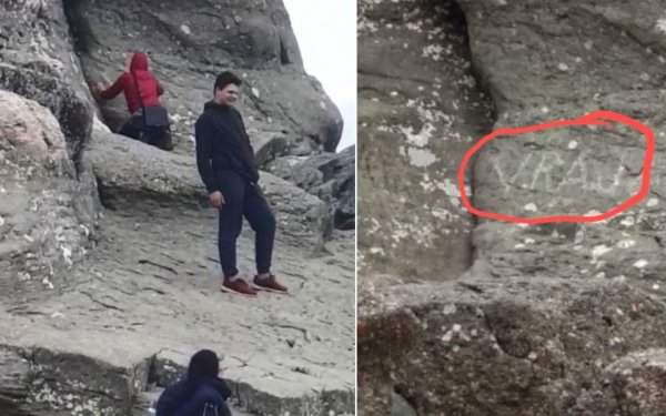 Sfinxul din Bucegi a fost vandalizat de un tânăr teribilist care a scrijelit pe monument cuvântul ‘Vraj’.