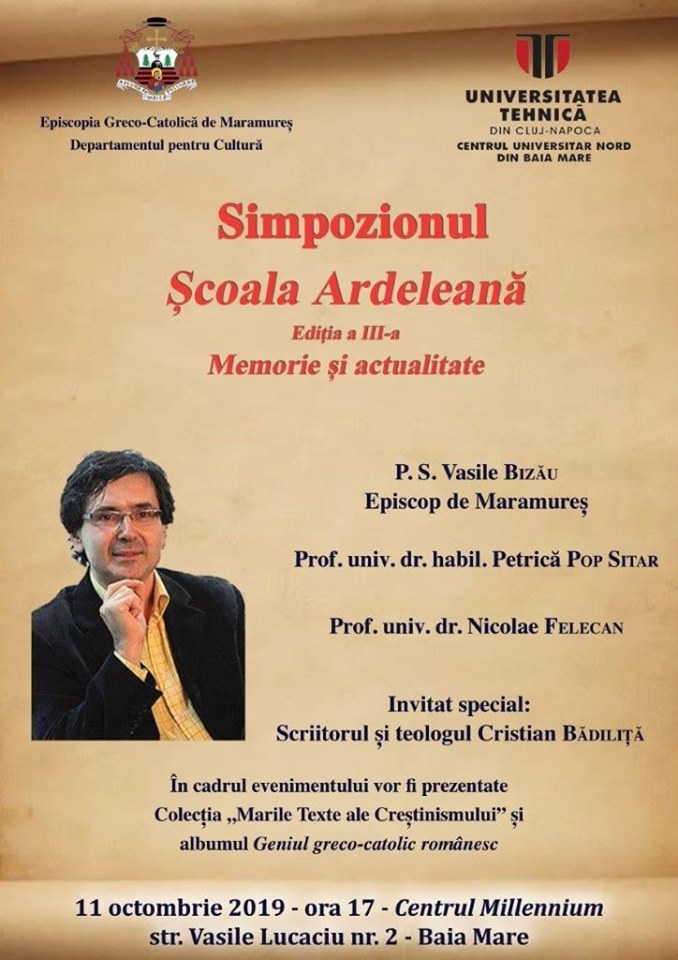 Departamentul pentru cultură din cadrul Episcopiei greco-catolice Maramureş vă invită să participați la cea de-a treia ediție a simpozionului „Școala Ardeleană”, cu tema „Memorie și actualitate”.