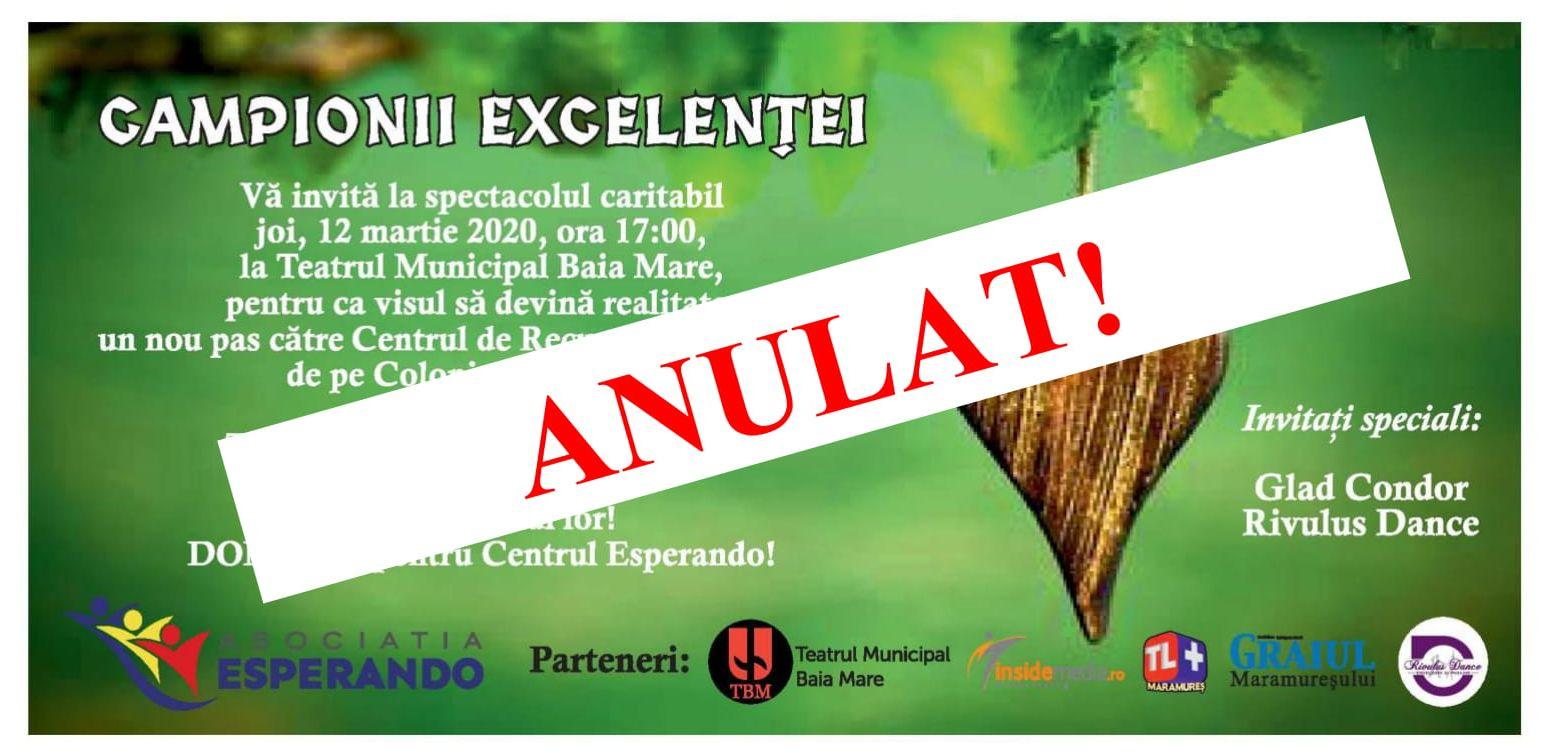 Având în vedere reglementările la nivel național în ceea ce privește suspendarea evenimentelor publice ca măsură de prevenție a răspândirii Corona Virusului, ne aflăm și noi în situația de a anula evenimentul care urma să aibă loc joi, 12 martie, de la ora 17:00, la Teatrul Municipal Baia Mare.