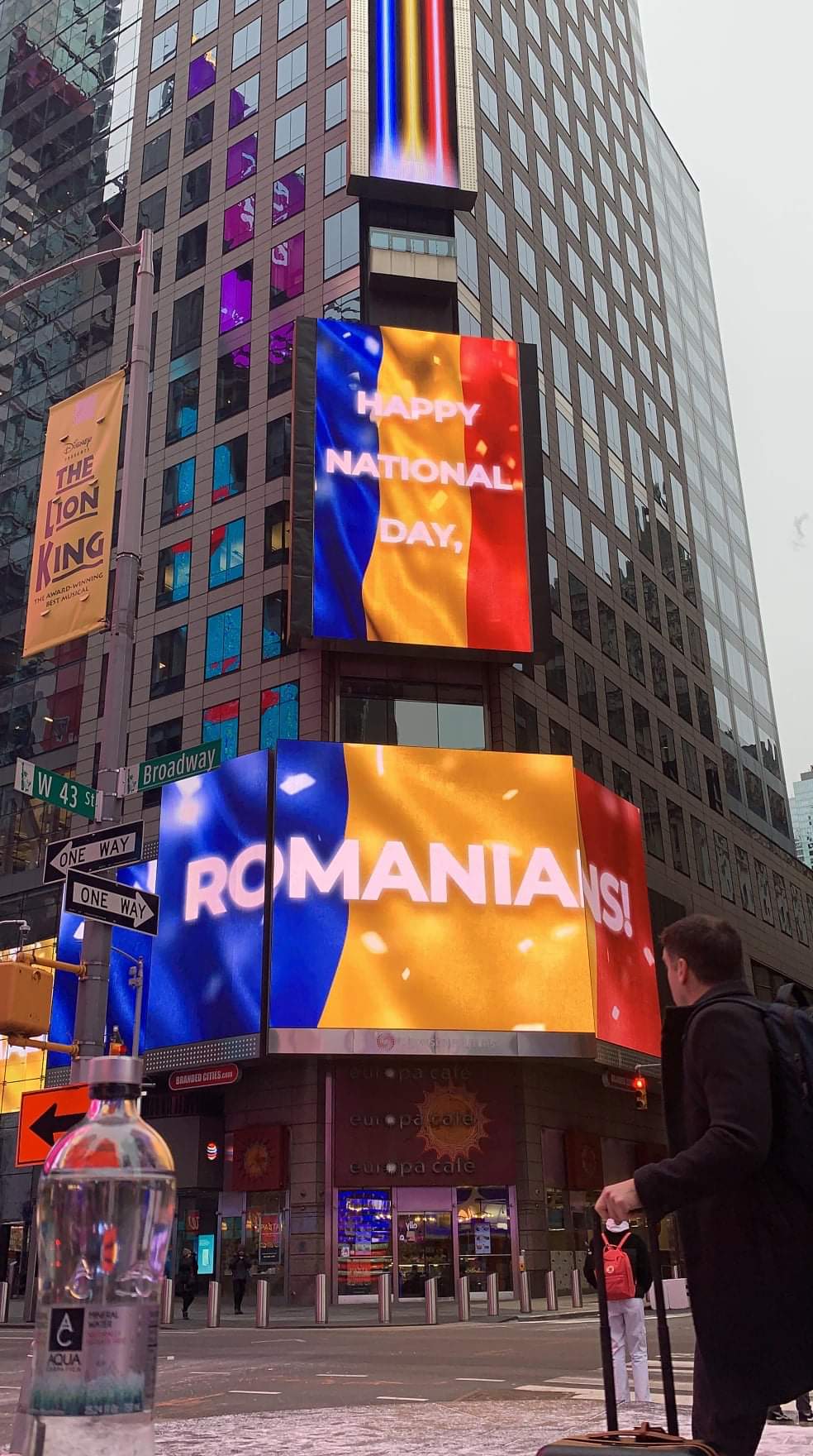 Drapelul național, munții Carpați și dulcele grai românesc se văd astăzi pe celebrele ecrane din Times Square, New York. Mulțumim României și românilor de pretutindeni” – este mesajul care a însoțit imaginile publicate pe pagina de Facebook Aqua Carpatica.