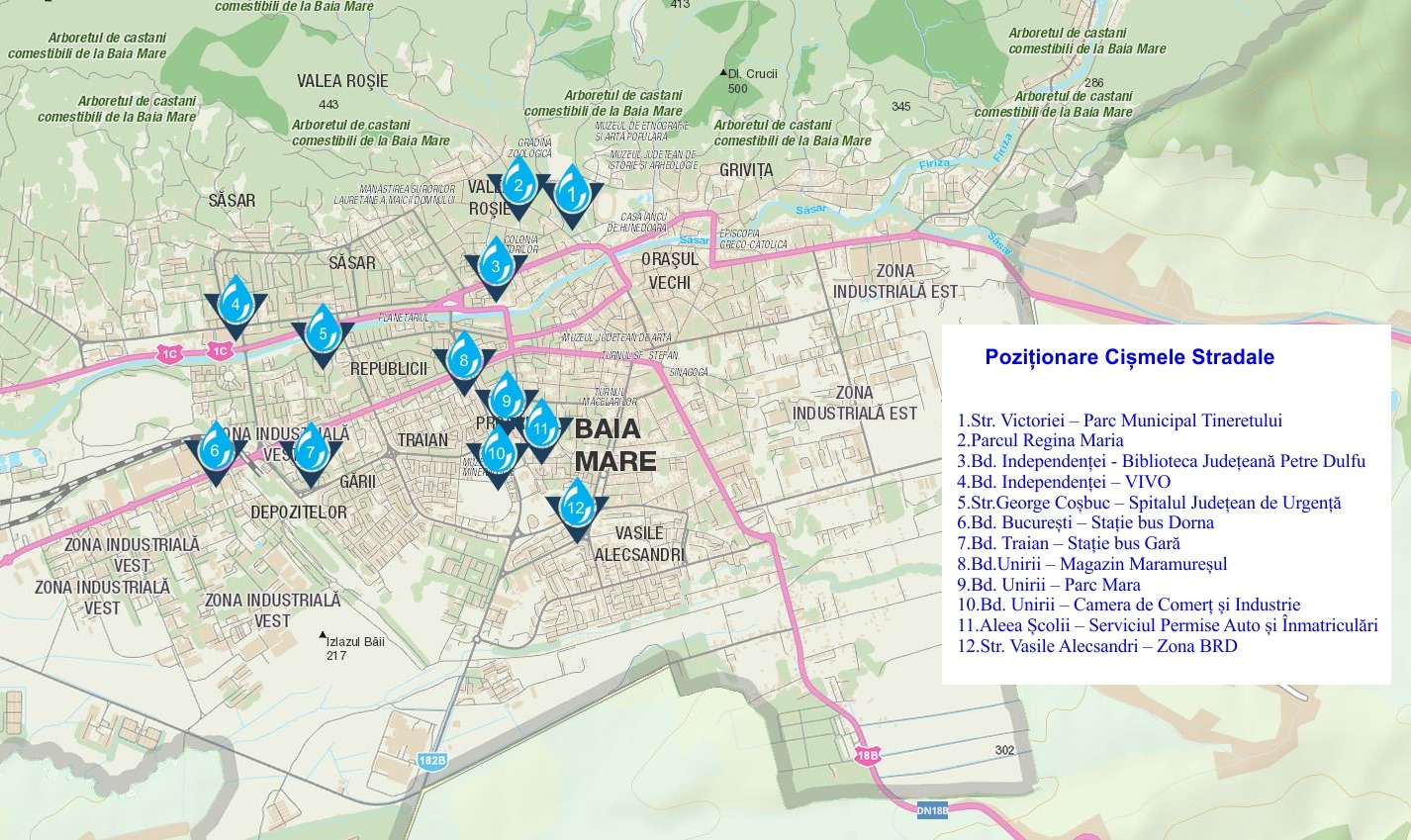 Vedeți unde sunt amplasate cele 12 cișmele cu apă potabilă, pe raza municipiului Baia Mare, de unde puteți să consumați apă direct sau să vă reîncărcați recipientul personal!