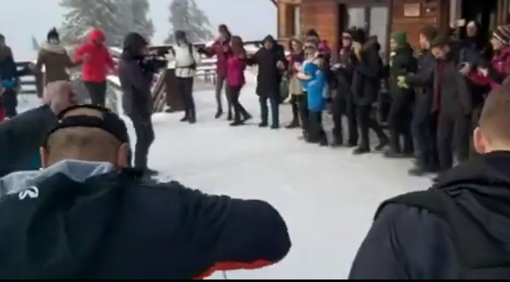Iniţial, acţiunea trebuia să aibă loc pe Vârful Postăvarul, dar apoi tinerii s-au prins în Hora Unirii la 1.700 de metri, în apropierea cabanei.